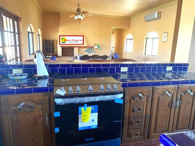 The kitchen has a great view window and peninsula shaped countertop looking on to the dining and living area with a wood burning fireplace. Step out to the grand palapa and mini kitchen for an outdoor dining experience. Inside the primary bedroom is a spacious is a grand master suite with his and her closets.